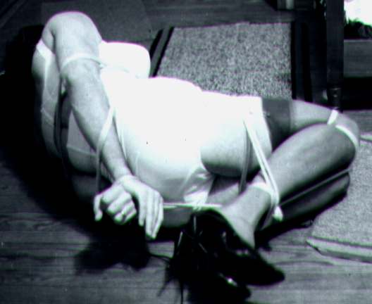 Many years ago I was attending a five-week course inn southern Virginia. Because it would be so long and motel rooms get to me in a few days, I rented a little kitchenette in an old motel out on old highway 1. In addition to greater convenience and size, it also provided privacy; none of my classmates wanted to go "clear out there". The latter is probably the real reason I stayed there. It wasn't fancy but with maid service every Saturday morning, it was clean and very private. One Saturday evening I decided to take some photos myself in bondage. The camera and flash were set on a tripod and a 20-foot extended shutter release bulb attached to the camera and positioned on the floor where I was lying. My outfit was all white, a well filled 36D bra; waist cincher around my waist bringing it down to 26 inches, (my was that a long time ago) and pure white panties stretched snugly from hip to hip, 38 inches, over a white garter belt. The nylons were an off-black with just a touch of vamp added by a pair of 4 inch black pumps. The position for the first photo would be the hogtie, one of my favorites. Starting with the ankles, my legs were also secured below and above my knees and my thighs. To make it a little more binding, my ankles were secured to the back of my thighs with two turns of rope. Tied in this manner, the legs are like a big knob and can only be moved about the waist. Several strands of rope just below the bra and several more about my waist were tightened so that my arms could just barely be squeezed into them, but before doing so a ball gag (white of course) stretched my jaw and was tightly knotted at the back of my neck. The final touch was securing the wrists. One end of a short braided nylon rope was tied to the rope around my ankles and the other was made into two concentric loops with a slip knot. When both wrists were put through both loops and pulled against the ankles, it felt very secure. Because nylon will give a little, I can usually work my hands loose with a little effort when I want to get out of my bondage. As a backup I usually had a knife within reach; however, when things go smoothly for a long time, a person tends to become careless: no knife!. After snapping the picture I decided to free myself by slipping my hands out of the double loops. It didn't take long to realize that I was caught. The two loops of rope were between the bump on my wrists and hands. Having never used braided rope for my wrists before I did not realize that it does not stretch or slip like twisted nylon. With all of the struggling to get into position for the photo, the rope to the ankles had caused the slip knot loop to be pulled very tight. With the ropes holding my arms tight against my back, there was no way to get loose. I began to twist and struggle and wiggle, but none of the ropes loosened even a little bit. After what seemed like forever but was only a few minutes, I was wringing wet and still very tightly tied. The only motion I could make was to bend a little at the waist and roll a little. Slowly, I began to realize my situation: wearing a very tight effective gag through which I could only moan, the maid wouldn't be in for another week, my classmates didn't even know where I was staying. Panic and fear were coming on pretty strong and struggling was useless. The ropes seemed to be getting tighter and the floor harder, everything was beginning to ache. I rubbed the ball gag against the floor trying to force it out of my mouth, but it didn't help; my jaw just ached more. The kitchen knives were a long way away, through a door and up in a drawer. There was no way to get to them. I considered knocking the TV (television) stand over, hoping the fall would break the picture tube and then using the glass to cut myself loose. It was the only chance to get out of what seemed like ever- tightening ropes, but it was turned on and I was afraid of being shocked. Then I remembered that in my jeans pocket there was a small penknife I had found that afternoon. The jeans were lying on a chair about eight feet away. With ropes holding my ankles to my thighs and more ropes keeping my arms tight against my back and my wrists securely attached to my ankles, eight feet was a very, very long way. But now with some hope and a goal, the panic was beginning to fade. Finally wriggling backwards to the chair, I pulled the trousers to the floor. I started to go through the pockets, but with my fingers starting to tingle and working behind my back, it was slow going. Again no knife, the knife wasn't there. After going through the pockets three more times the feeling of helplessness and panic started to grow again. The Knife wasn't there! I really started to think fast. What was on or near the floor that I could get to cut myself loose. The TV set idea still scared my because it was on and I couldn't be sure it wouldn't land on me, and if it did, wouldn't break, or if it did break I would be electrocuted. My only hope was to get to the kitchen drawer, but to do that some of the ropes had to go. After what seemed like the best effort I could muster, I got the rope around my ankles and thighs hooked on the corner of the bed frame. By lurching and wiggling while pressing my ankles as tight as possible against my thigh, I finally slipped it over my knees. It wasn't much, but that little bit of freedom was wonderful. With that additional movement available, my head against the side of the bed and a lot of struggling I was able to get up on my knees. In that position I could scoot the 20 odd feet to the kitchen, pushing the door open as I went, hook the ballgag rope on the knife drawer and dump it on the floor. The 20 feet looked like the last third of the Boston Marathon but it was my only hope to get free. It had to be soon because there was no feeling left in my hands. Before starting on the long journey I happened to look back at the jeans on the floor. There it was; the penknife laying on the floor next to