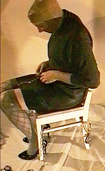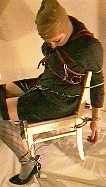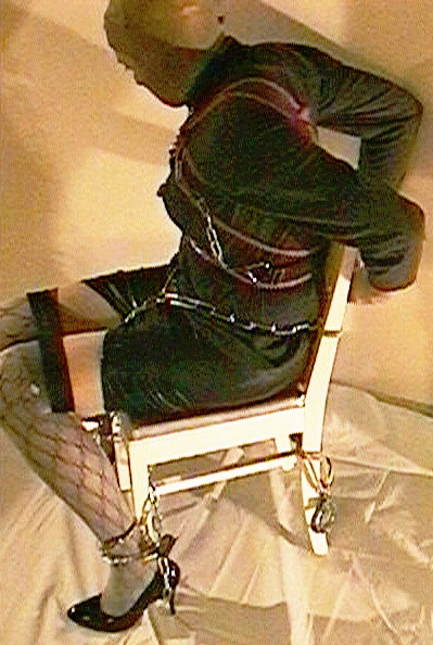 Taking seat on chair. I'm gagged with several latex straps around my head with only eyes and nose left free. I wasn't able to hear anything. The tapes are fixed with a nylon stocking, so I could not get away the tapes.