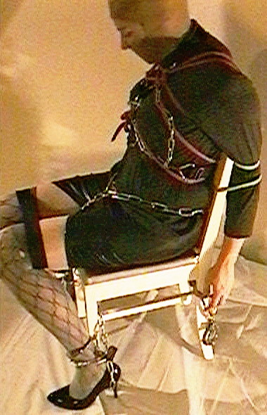I fixed a long chain around my chest, going between my legs to the chair. On this chain I'll later cuff my legs by a second chain under the chair.